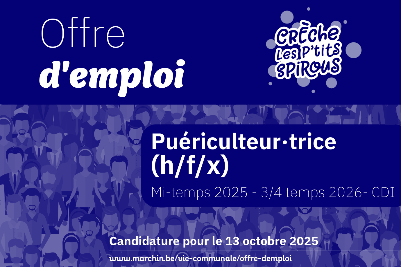 La Commune de MARCHIN procède au recrutement d’un·e puériculteur·trice (f/m/x) pour la crèche communale « Les P’tits Spirous » à mi-temps (17h30/semaine) du 3/11 au 31/12/25, puis à 3/4 temps (26h15/semaine) dès le 1/01 contrat à durée indéterminée. Les candidatures doivent être envoyées au plus tard pour le 13 octobre 2025. Consultez l’offre complète :