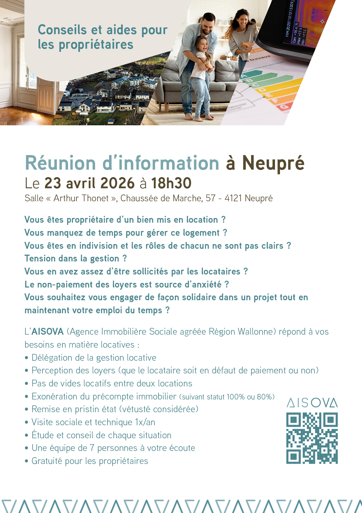 L’AIS Ourthe Vesdre Amblève (AISOVA), organise une séance d’information générale sur la Commune de Neupré le jeudi 23 avril à 18h30.